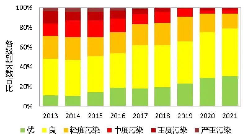 2013-2021年北京市空气质量各级别天数分布/北京市生态环境局供图