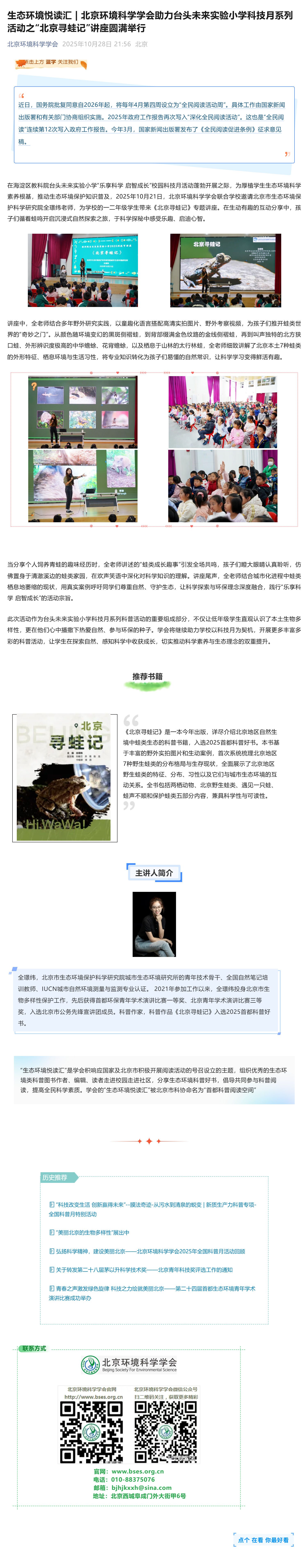 生态环境悦读汇 | 北京环境科学学会助力台头未来实验小学科技月系列活动之“北京寻蛙记”讲座圆满举行